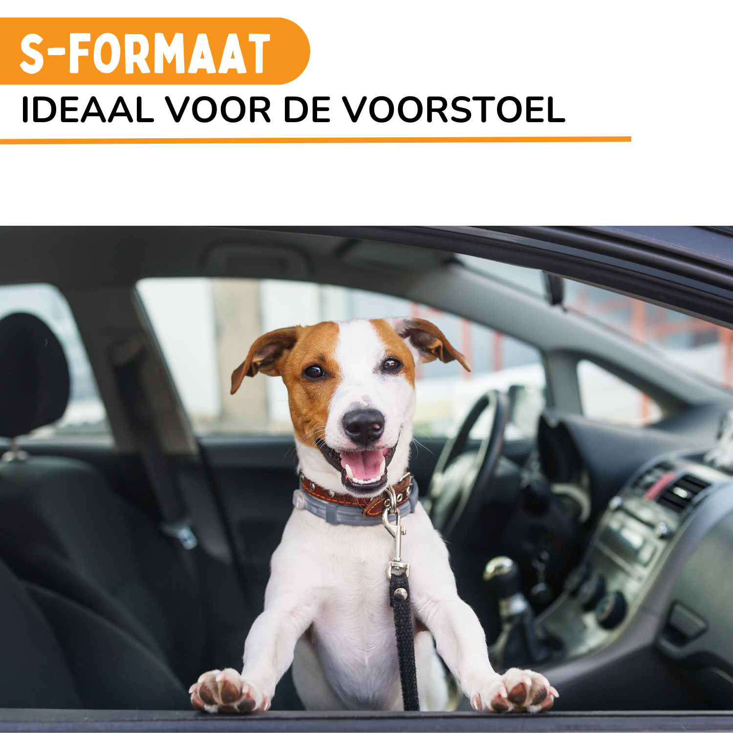 - Maat S: Geschikt voor kleinere honden. Past perfect op de voorstoel, maar kan uiteraard ook op de achterbank geplaatst worden.