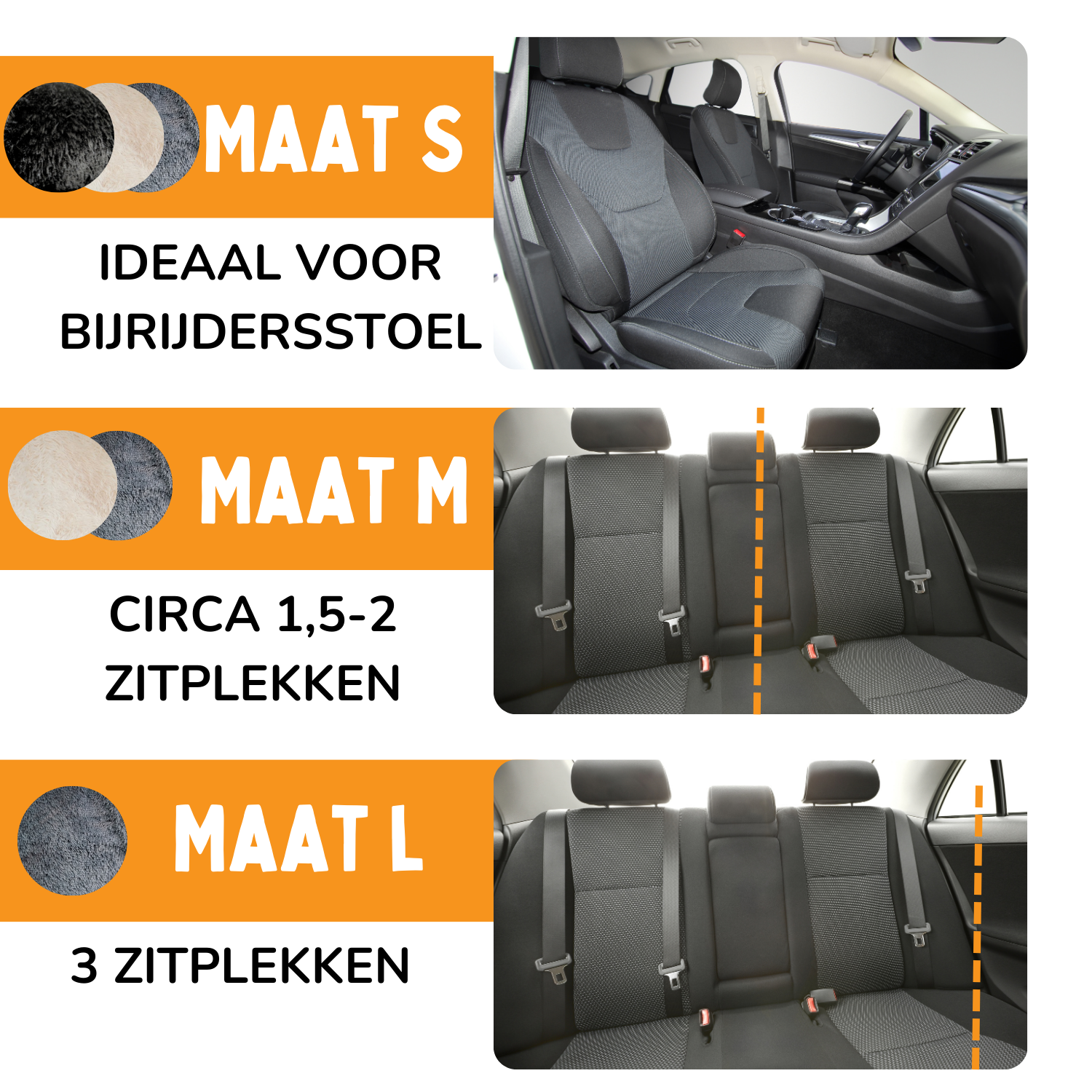 - Maat L: Geschikt voor de grotere rassen. Beslaat de gehele achterbank, dus 3 zitbanken. Ideaal voor grotere honden of meerdere honden.