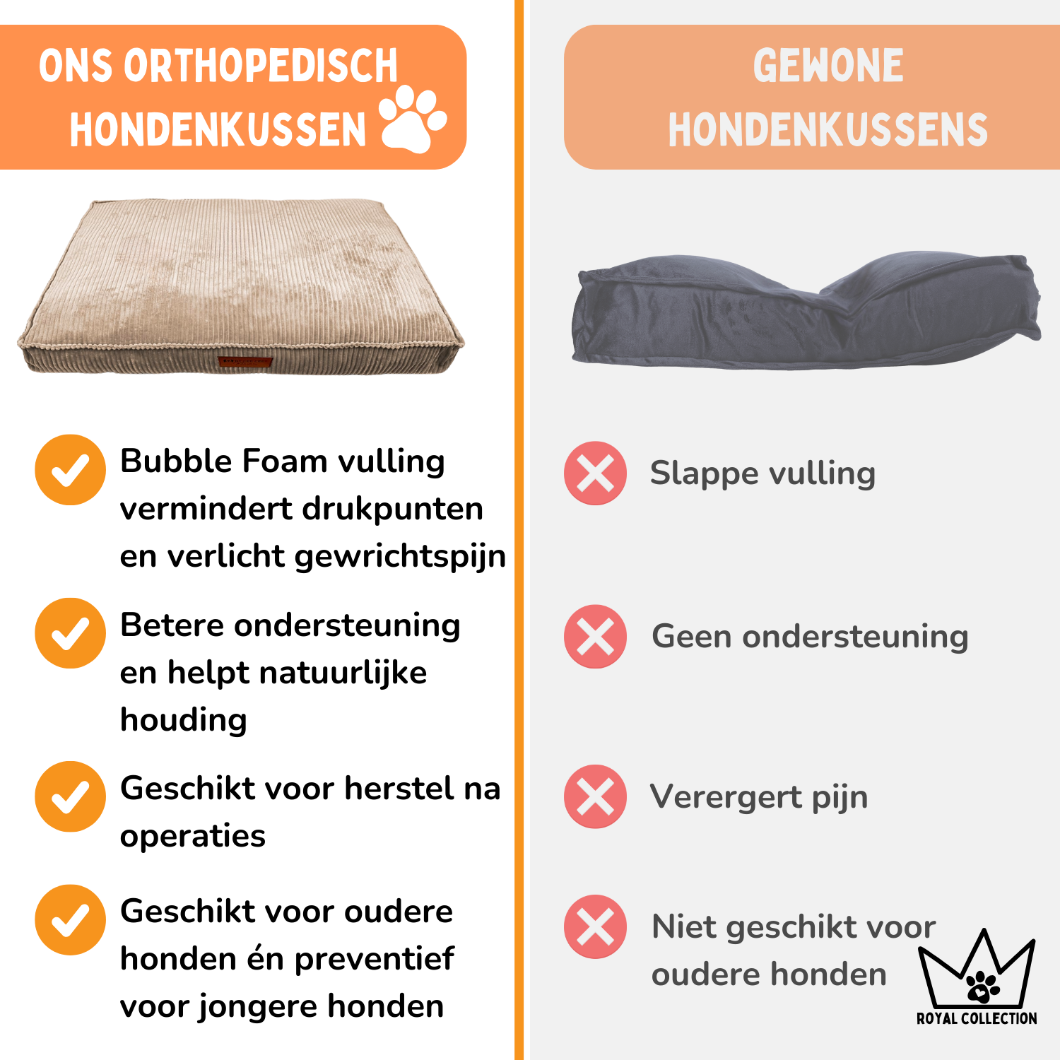 Optimale gewrichtsondersteuning: De hoogwaardige orthopedische “bubble” schuimlaag biedt uitstekende drukverdeling, waardoor pijnlijke gewrichten, spieren en botten worden ontlast. Perfect voor honden met artritis, heupdysplasie of andere gewrichtsproblemen. Ook volledig gezonde honden profiteren van deze ondersteuning en kan zelfs problemen in de toekomst helpen voorkomen.