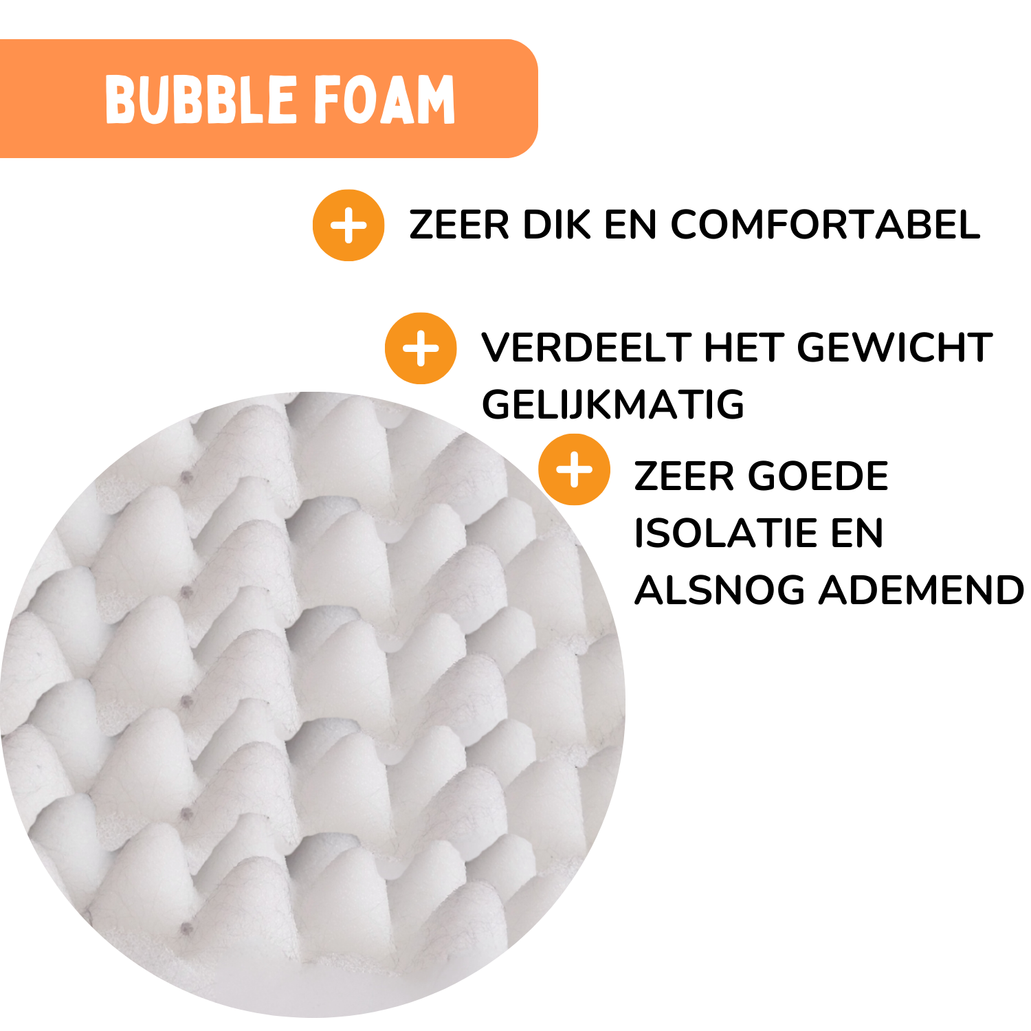 Bubble foam van topkwaliteit: Deze lichte, veerbare bubble vulling past zich aan de vorm van je hond aan en zorgt voor een diepe, rustgevende slaap. Het materiaal veert vervolgens terug naar zijn originele vorm, waardoor het bed jarenlang meegaat zonder in te zakken.