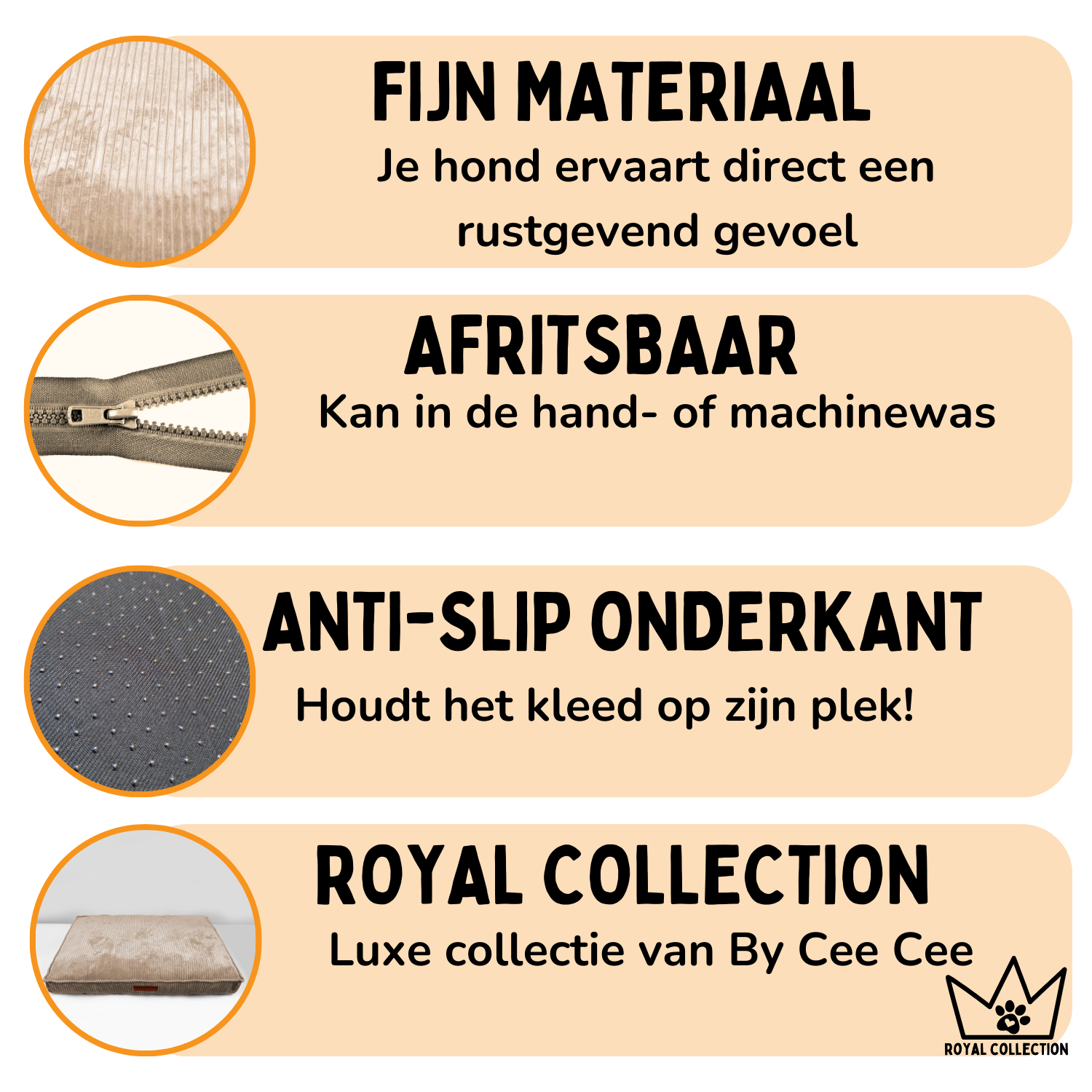 Luxe en stijlvol design: Naast comfort heeft By Cee Cee ook gedacht aan stijl. Het hondenkussen heeft een elegant en tijdloos ontwerp dat perfect in elk interieur past, of het nu in de woonkamer, slaapkamer of zelfs in de keuken staat. Het is niet voor niks onderdeel van de Royal Collection van By Cee Cee.