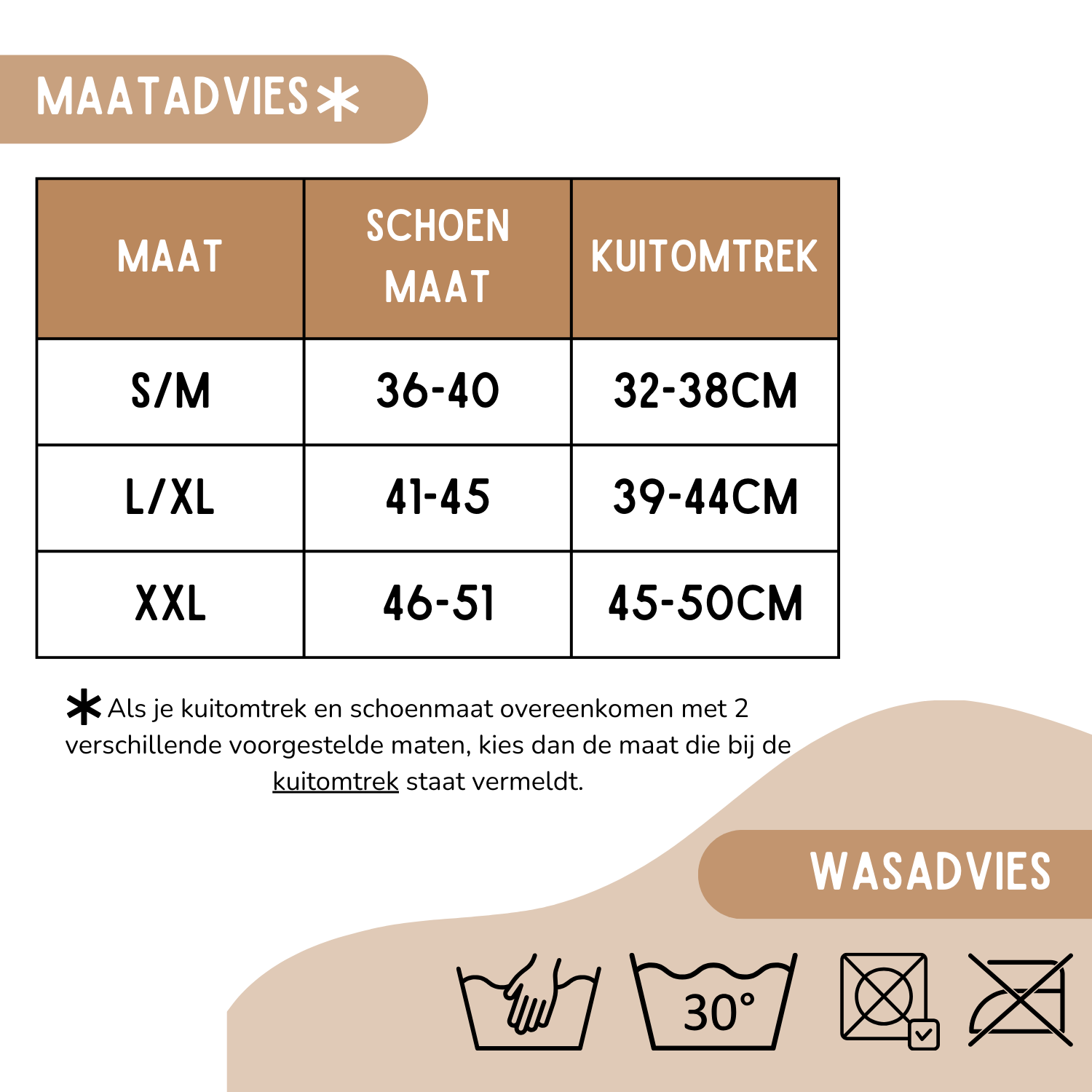 *Als je kuitomtrek en schoenmaat overeenkomen met 2 verschillende voorgestelde maten, kies dan de maat die bij de kuitomtrek staat vermeldt.